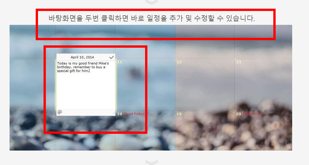 바탕화면에서 두 번 클릭하면 곧바로 여러분들이 원하시는 날짜에 일정을 추가하거나 내용을 이후에도 수정하실 수 있는 기능이 탑재되어 있습니다. 위 오른쪽 사진을 참고하시면 되겠습니다. 글자수에 제한도 있는 게 아니라서 제한 없이 메모를 하시면 되겠습니다. 좀 더 색깔을 선택하면 맨 오른쪽 사진과 같이 화려하게 꾸밀 수도 있습니다. 꾸미기를 좋아하시는 분들이라면 해당 기능을 잘 활용해 볼 수 있겠습니다.